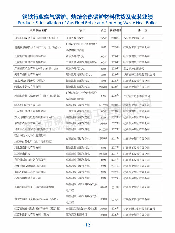 鋼鐵行業燃氣鍋爐、燒結余熱鍋爐材料供貨及安裝業績(二)